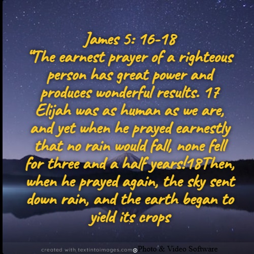 James 5: 16-18 “The earnest prayer of a righteous person has great power and produces wonderful results. 17Elijah was as