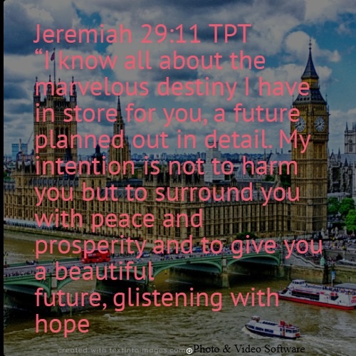 Jeremiah 29:11 TPT “I know all about the marvelous destiny I have in store for you, a future planned out in detail.